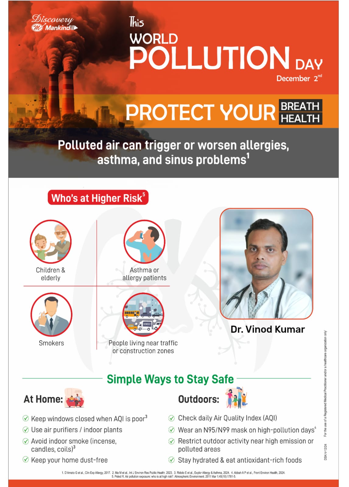 This poster highlights World Pollution Day and raises awareness about how polluted air can worsen asthma, allergies, and sinus issues. It identifies high-risk groups such as children, the elderly, smokers, and people living near traffic. The poster also provides simple safety tips—like checking AQI, using masks, and keeping indoor air clean—to protect respiratory health.